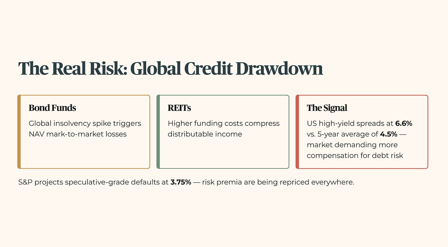 The risk for a Singapore retail investor is not necessarily a local default. The risk is a global credit drawdown. When global insolvencies spike, as S&P is now projecting at 3.75% for the speculative-grade universe, risk premia are repriced everywhere. This hits your bond funds through NAV mark-to-market losses and hits your REITs through higher funding costs. US high-yield spreads are already running at 6.6%, signaling that the market is beginning to demand significantly more compensation for debt risk than the five-year average of 4.5%.