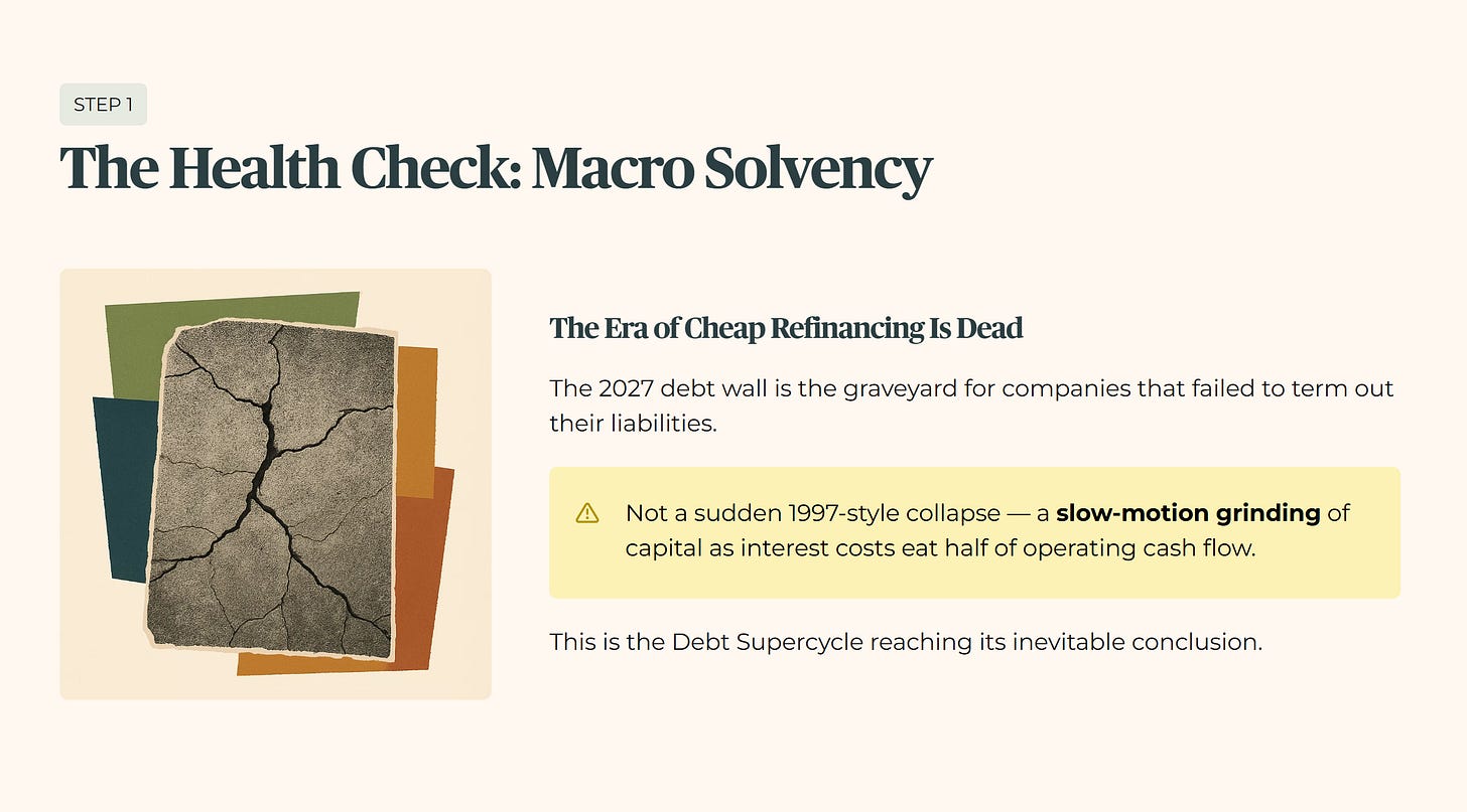 The era of cheap refinancing is dead, and the 2027 debt wall is the graveyard for companies that failed to term out their liabilities. We are not looking at a 1997-style collapse, which was a sudden currency and liquidity crisis. We are looking at a slow-motion grinding of capital as companies that gorged on cheap money now face a reality where interest costs eat half their operating cash flow. This is the Debt Supercycle reaching its inevitable conclusion.