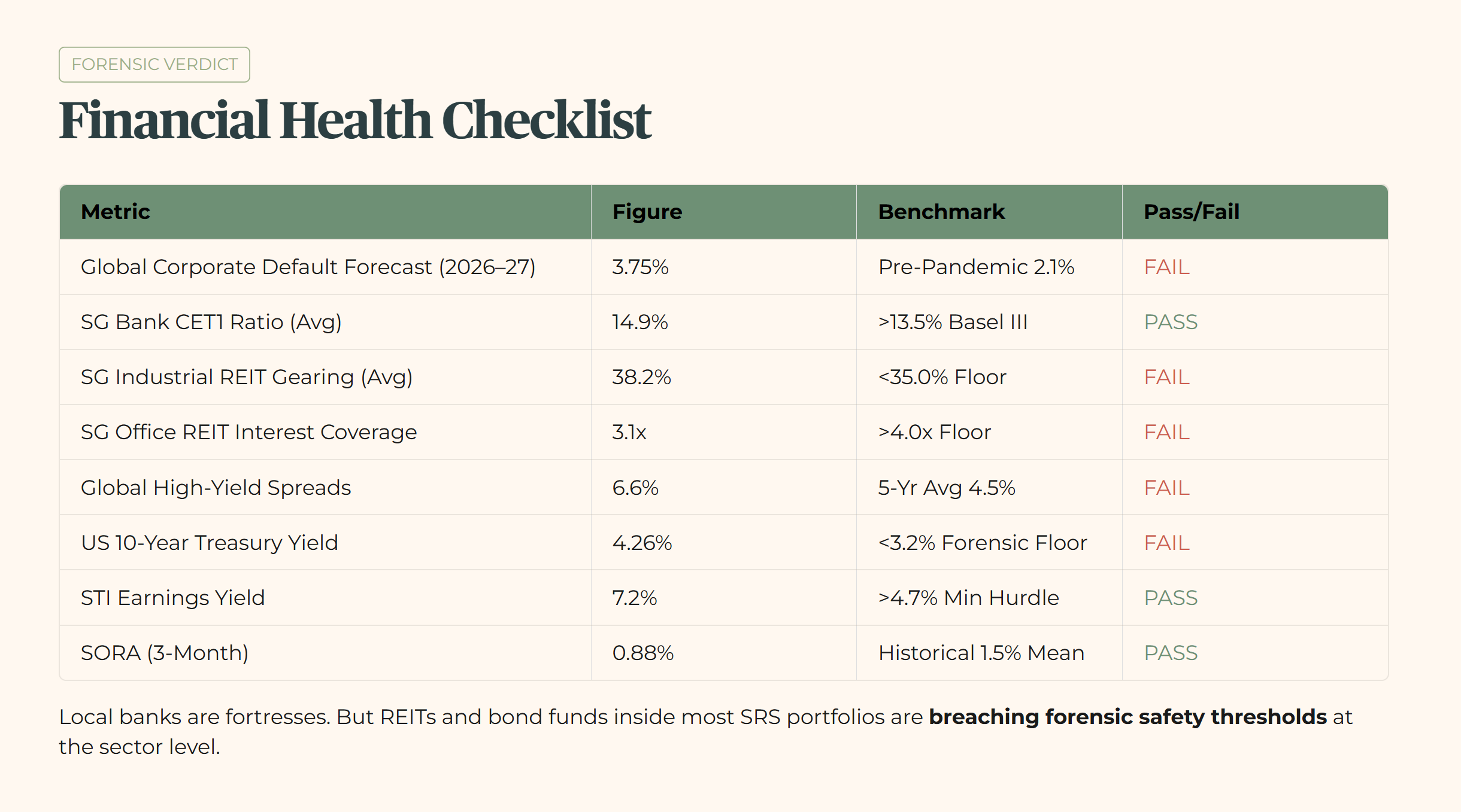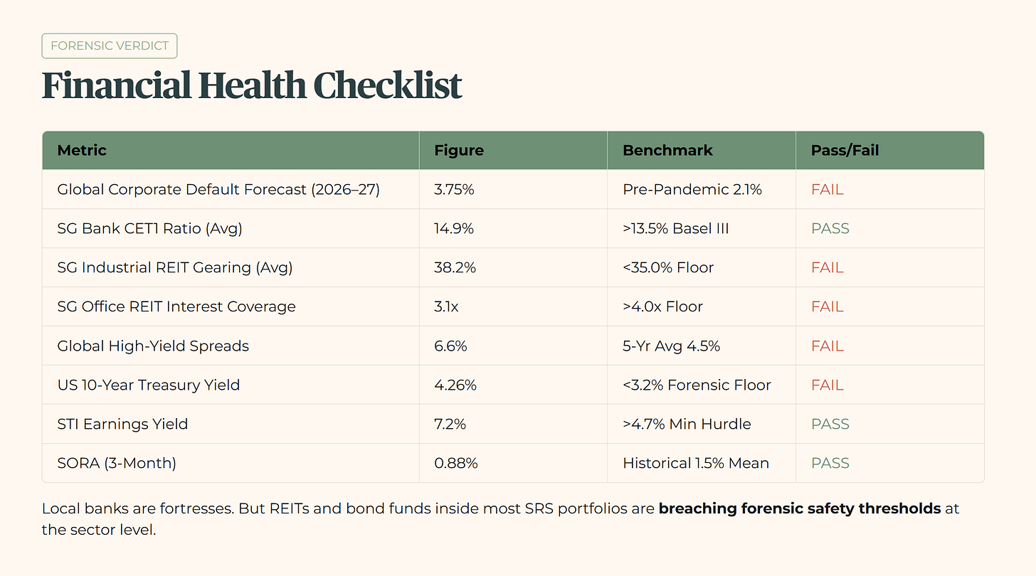 The data shows a clear divergence. Our local banks are fortresses, maintaining CET1 ratios near 15%. The STI’s earnings yield of 7.2% clears the minimum hurdle with room to spare. However, the yield-generating assets sitting inside most SRS portfolios, specifically REITs and bond funds, are breaching my forensic safety thresholds at the sector level.