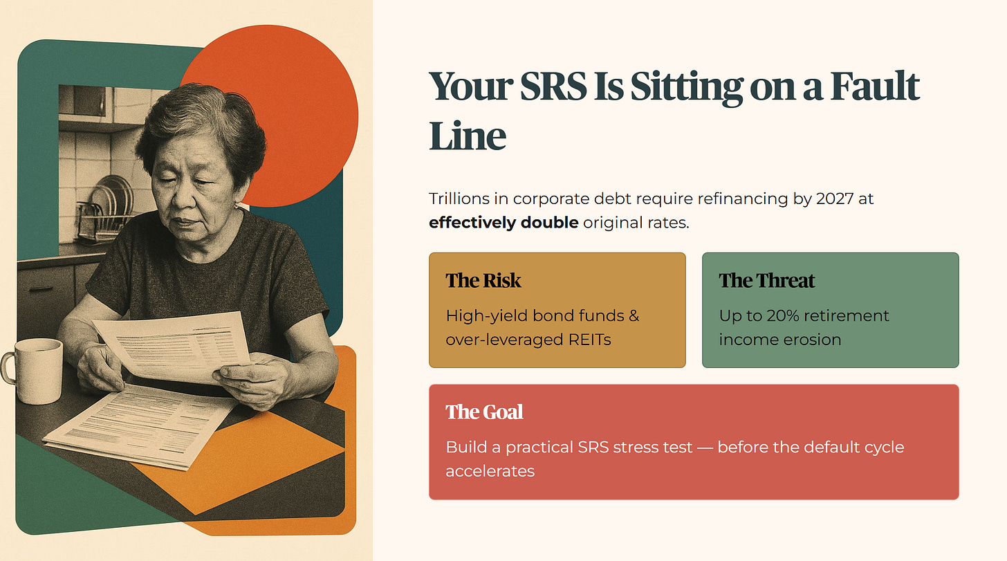 The global corporate debt load has surged to a record high, with trillions requiring refinancing by 2027 at rates effectively double their original coupons. If you are holding high-yield bond funds or over-leveraged REITs in your SRS, your retirement cash flow is sitting on a fault line that could erase 20% of your income. Today we build a practical SRS stress test to identify exactly what breaks first in your portfolio before the global default cycle accelerates.