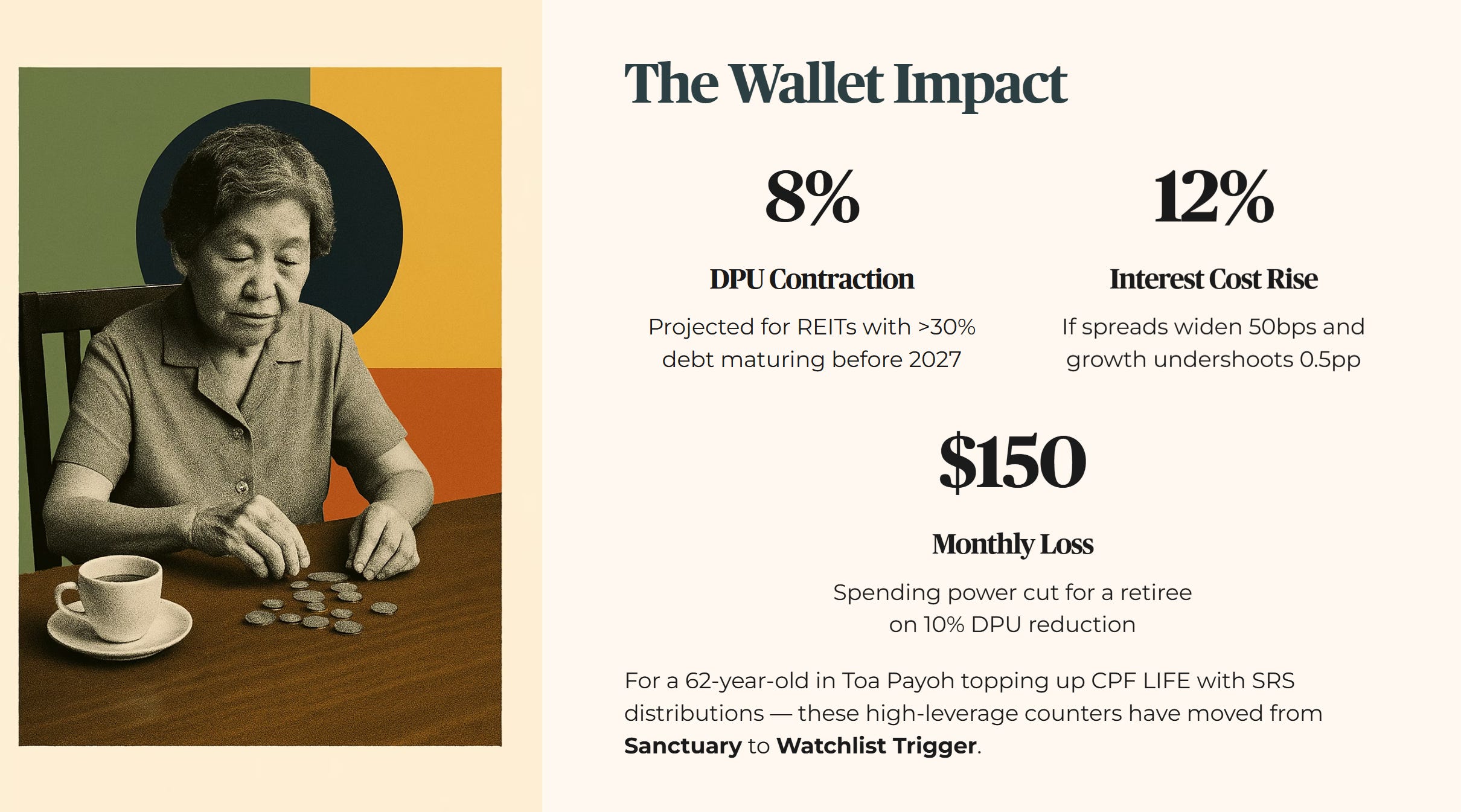 Wallet Impact: Consider a 62-year-old retiree in Toa Payoh who relies on SRS distributions to top up her CPF LIFE payouts. A 10.0% cut in DPU from her industrial REIT holdings translates to roughly $150 less in monthly spending power. For this investor, these high-leverage counters have moved from Sanctuary status to a Watchlist Trigger.