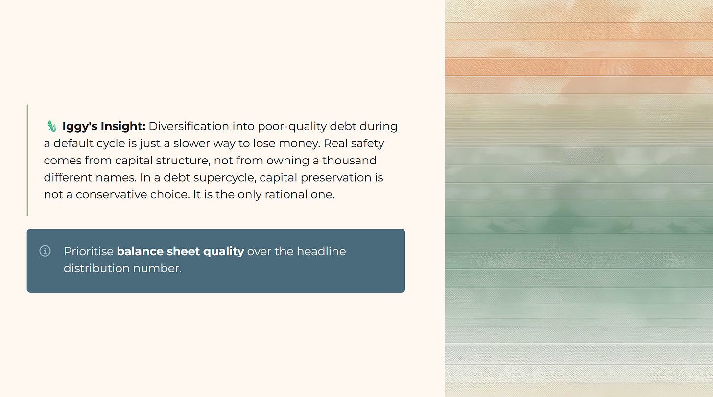 Many investors think they are safe because they hold “diversified” bond funds in their SRS. But diversification into poor-quality debt during a default cycle is just a slower way to lose money. If the fund manager is chasing 7.0% yields in an environment where the risk-free rate is elevated, they are likely holding paper that will be the first to burn when the 2027 debt wall arrives. Real safety comes from capital structure, not from owning a thousand different names. Prioritise balance sheet quality over the headline distribution number. In a debt supercycle, capital preservation is not a conservative choice. It is the only rational one.