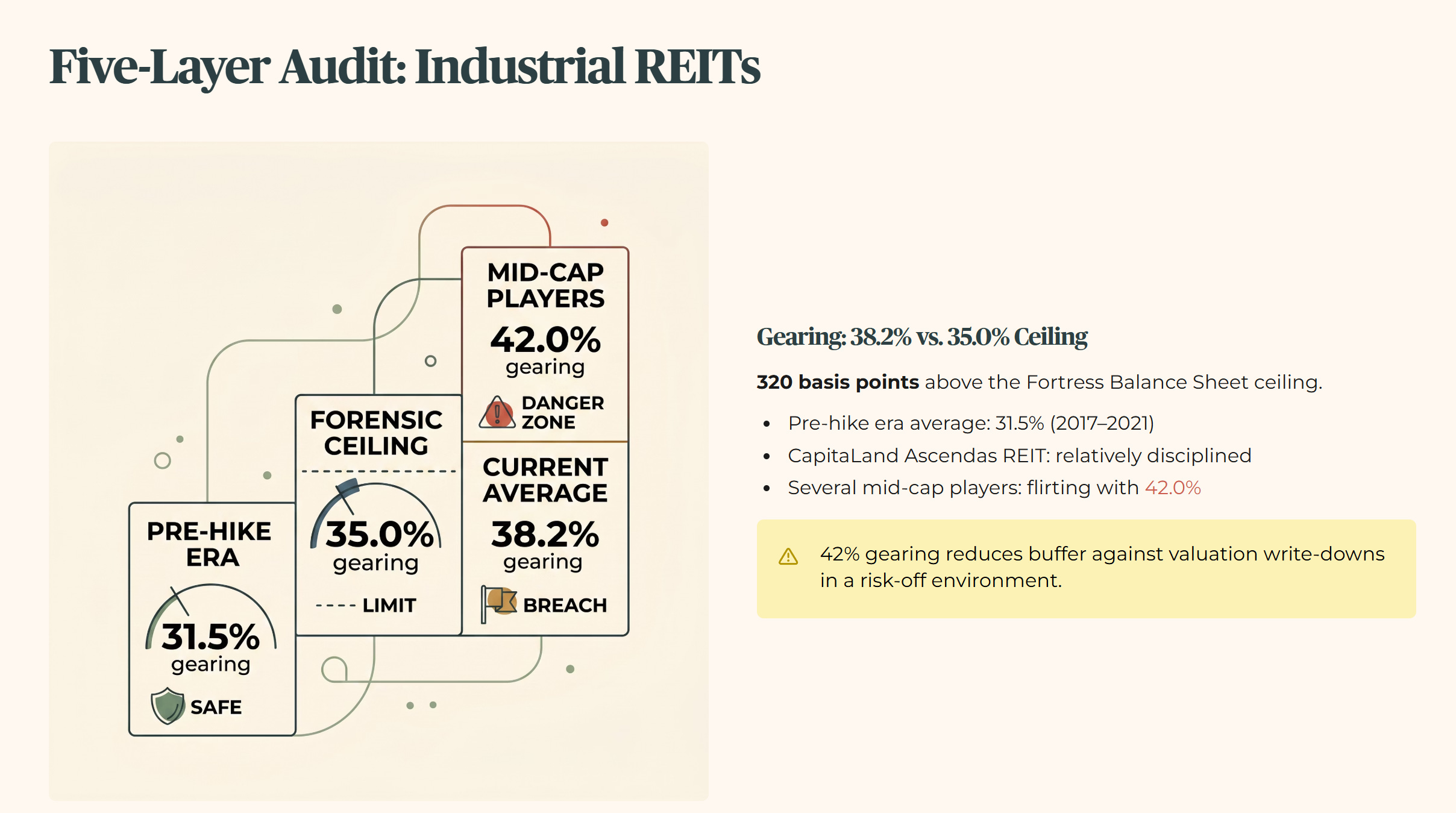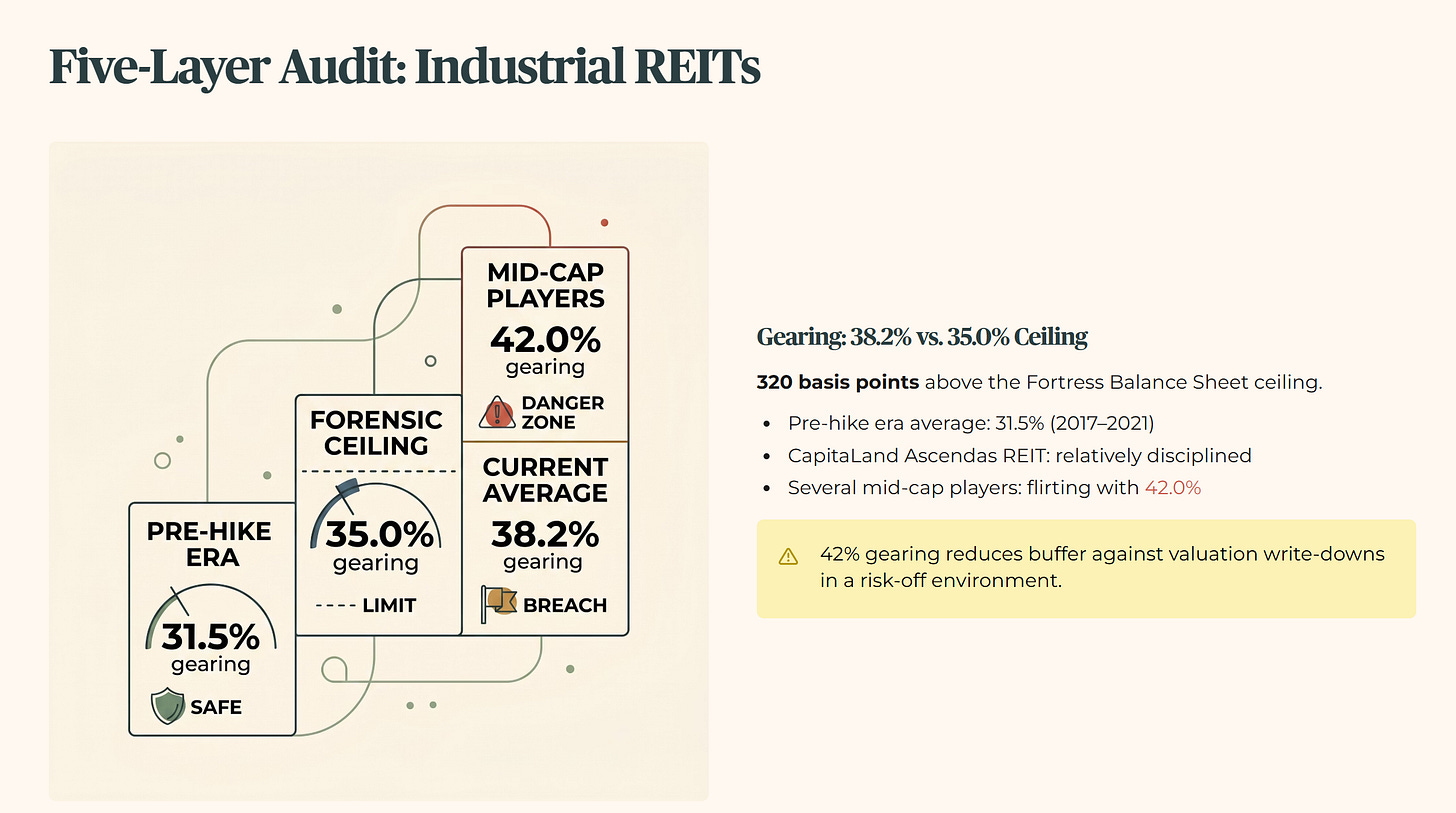 The sectoral gearing average for Industrial REITs currently sits at 38.2%. That is above my 35.0% ceiling. So I apply the full forensic treatment.