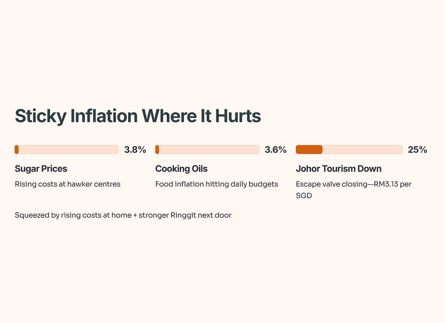 And here is the kicker: The “Johor Escape Valve” is closing. For years, Singaporeans have mitigated local inflation by crossing the causeway for cheap groceries and petrol. That trade is dying. The Malaysian Ringgit has strengthened to RM3.13 per SGD as of yesterday—its strongest level since March 2022. Johor tourism is already down 25% YoY because the math doesn’t work anymore. You are being squeezed by rising costs at home and a stronger currency next door.