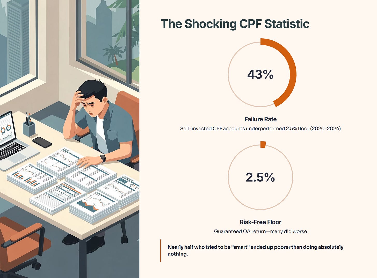 However, the most shocking statistic comes from the CPF Board. In a desperate bid to beat inflation, many Singaporeans took their money out of the guaranteed Ordinary Account (OA) to invest it themselves. The result? 43% of self-invested CPF accounts underperformed the risk-free 2.5% floor between 2020 and 2024. Let that sink in. Nearly half of the people who tried to be “smart” ended up poorer than if they had done absolutely nothing.
