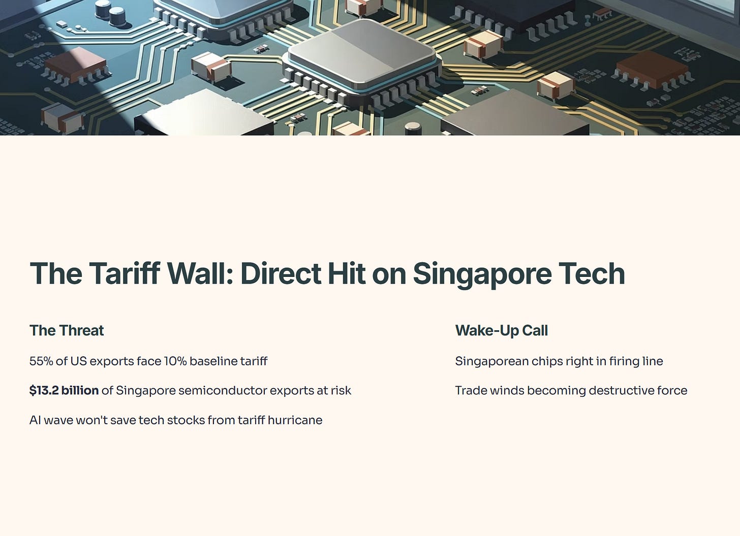 To make matters worse, the trade winds are turning into a hurricane. We are looking at a scenario where 55% of US exports are now facing a baseline tariff of 10%. For an open economy like Singapore, this is a direct hit. Specifically, S$13.2 billion worth of our semiconductor exports are at risk. If you are holding tech stocks thinking the AI wave will carry you forever, you need to wake up. The “Tariff Wall” is being built, and Singaporean chips are right in the firing line.