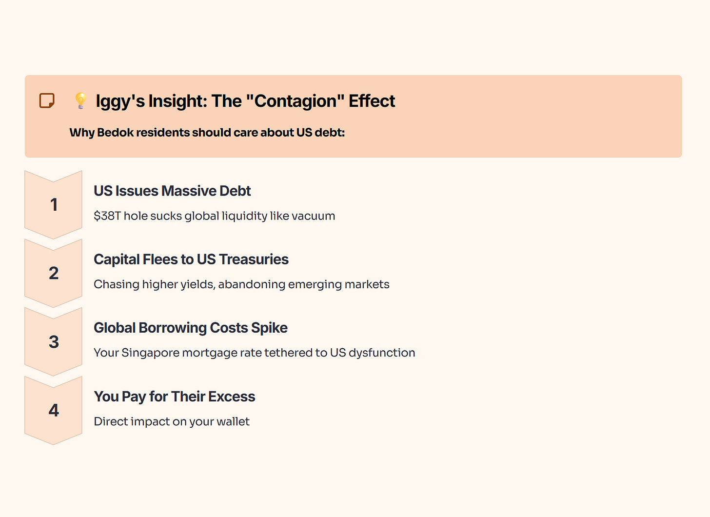 Most investors think, “I live in Bedok, why do I care about US debt?” Here is the mechanism: When the US government has to issue massive amounts of debt to cover that $38T hole, they suck global liquidity out of the room like a vacuum. Capital flees emerging markets and safe havens alike to chase US Treasury yields. This spikes borrowing costs globally. Your mortgage rate in Singapore is ultimately tethered to this dysfunction. You are paying for their excess.