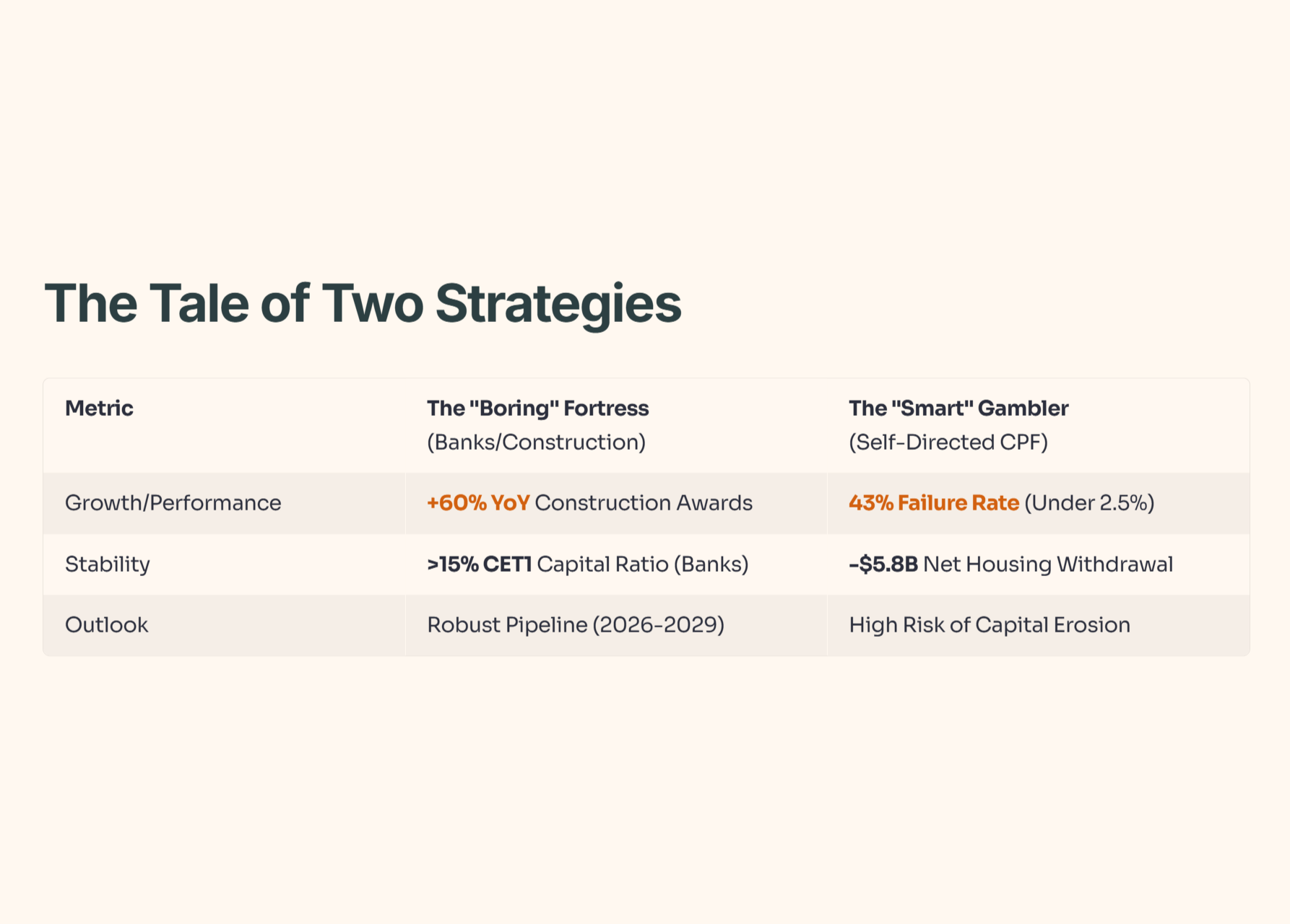 When you take money out of your CPF OA to buy a stock that drops, you suffer a double loss. First, you lose the capital. Second, you lose the compounded interest that the 2.5% (or 4% in SA) would have generated risk-free. That 43% failure rate isn’t just a statistic; it represents thousands of Singaporeans who delayed their retirement by trying to rush it.