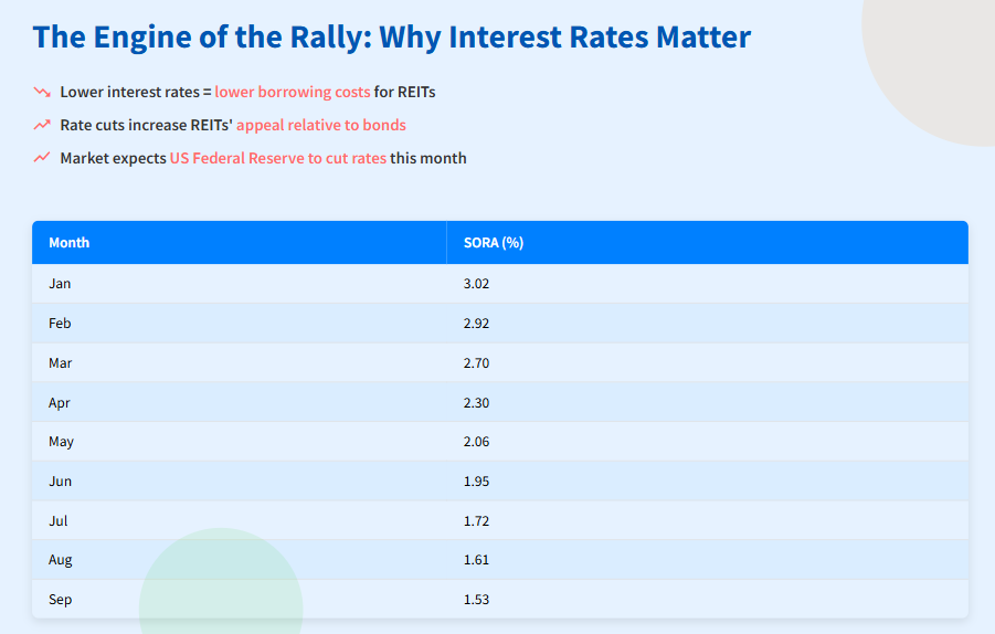 This data illustrates the clear upward momentum of the S-Reit sector in 2025, with a significant acceleration in the third quarter. After a relatively flat start to the year, the index broke out as expectations of interest rate cuts solidified. This trend shows growing investor confidence and highlights the market's sensitivity to macroeconomic policy shifts, which is the core theme of this rally.