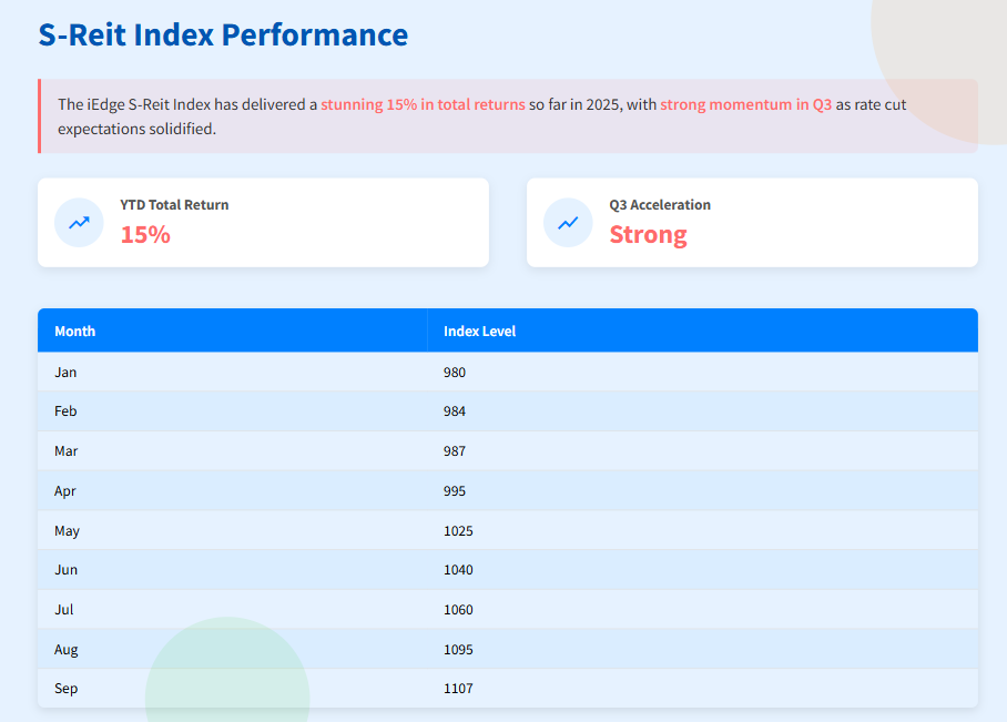 The market has responded swiftly. The iEdge S-Reit Index, which tracks the sector, has climbed to a year-to-date high, delivering a stunning 15% in total returns so far in 2025. The momentum in the third quarter has been particularly strong.