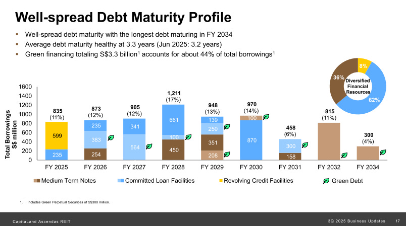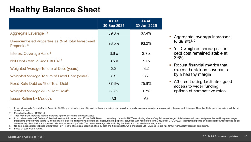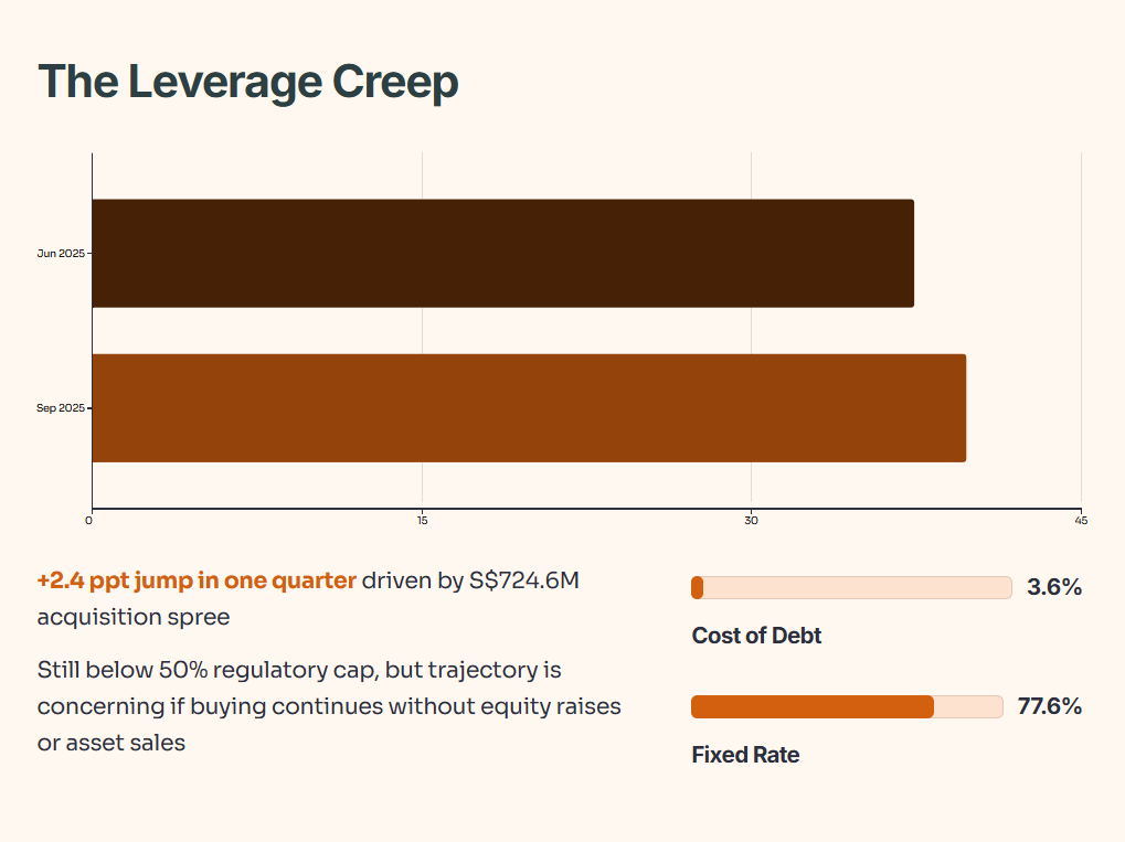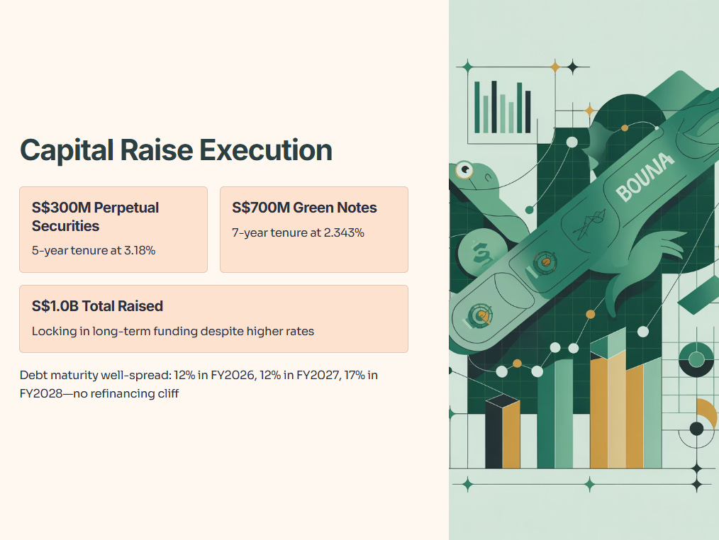 Aggregate leverage climbed to 39.8% as of September 30, 2025, up from 37.4% in June. That’s a 2.4 percentage point jump in one quarter, driven by the S$724.6 million acquisition spree. CLAR raised S$1.0 billion in capital during the quarter—S$300 million in 5-year perpetual securities at 3.18% and S$700 million in 7-year green notes at 2.343%. That’s impressive execution, locking in relatively cheap long-term funding despite the higher rate environment.