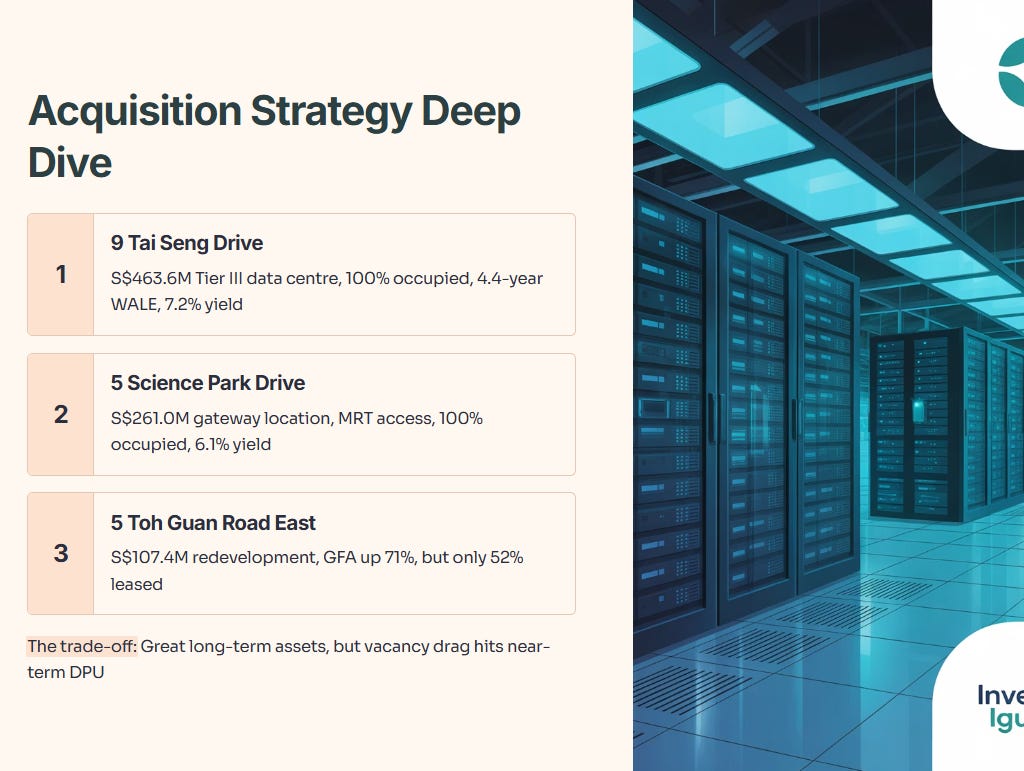 From a Singapore investor’s lens, the acquisition strategy makes sense if you believe industrial and data centre demand will stay robust. Data centres are the crown jewel here—9 Tai Seng Drive is a Tier III colocation facility acquired for S$463.6 million, and it’s fully occupied with a 4.4-year weighted average lease expiry (WALE). That’s the kind of sticky, high-quality income stream that justifies paying up. But the redevelopment at 5 Toh Guan Road East is only 52% occupied (with another 13% in advanced negotiations). That’s immediate dilution to near-term cash flow until leasing picks up.