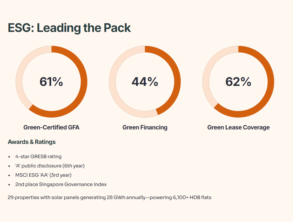 Green financing totals S$3.3 billion, or 44% of total borrowings. Twenty-nine Singapore properties have solar panels installed, projected to generate 28 GWh annually—enough to power over 6,100 four-room HDB flats. Green lease coverage hit 62% of net lettable area, up 8 ppt from 2024.