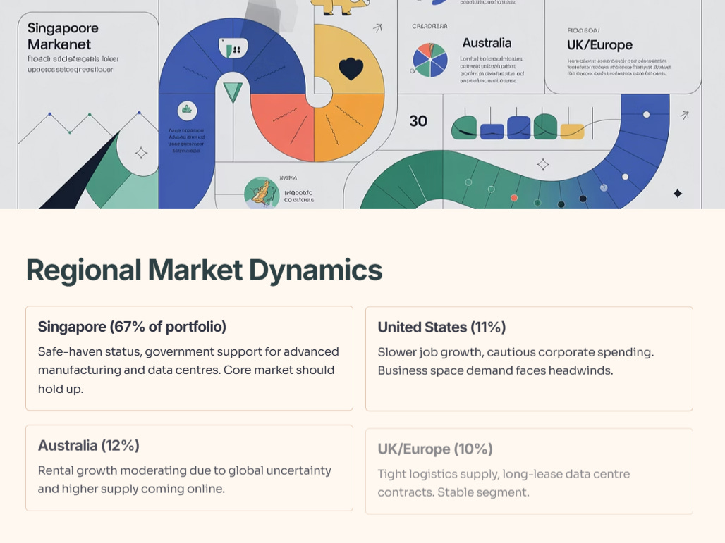 What does this mean for CLAR? Singapore remains the anchor—67% of portfolio value. As long as Singapore’s economy stays resilient and foreign investment flows continue (driven by safe-haven status and government support for advanced manufacturing and data centres), CLAR’s core market should hold up. The US exposure (11% of portfolio) faces headwinds from slower job growth and cautious corporate spending, which could weigh on business space demand. Australia (12%) is seeing rental growth moderate due to global uncertainty and higher supply. UK/Europe (10%) benefits from tight logistics supply and long-lease data centre contracts, so that segment should stay stable.