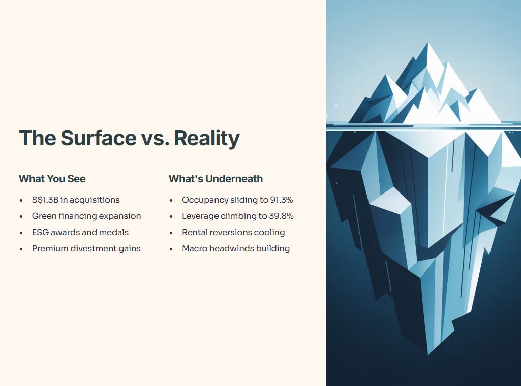 But ESG doesn’t pay the rent. What matters for your DPU is occupancy, rental growth, and cost control. The green credentials help on the margin, but they won’t save you if macro demand collapses or if CLAR overpays for acquisitions.