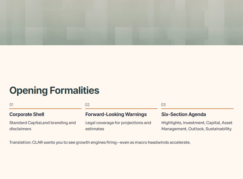 The report opens with the standard corporate shell—CapitaLand branding, a snapshot of 1 Science Park Drive, and the usual forward-looking statement warnings. Nothing actionable here, but it sets the tone: this is a REIT running hard to stay ahead. The agenda promises six sections—Highlights, Investment Management, Capital Management, Asset Management, Market Outlook, and Portfolio Resilience & Sustainability. Translation: CLAR wants you to see growth engines firing on all cylinders, even as macro headwinds pick up speed.
