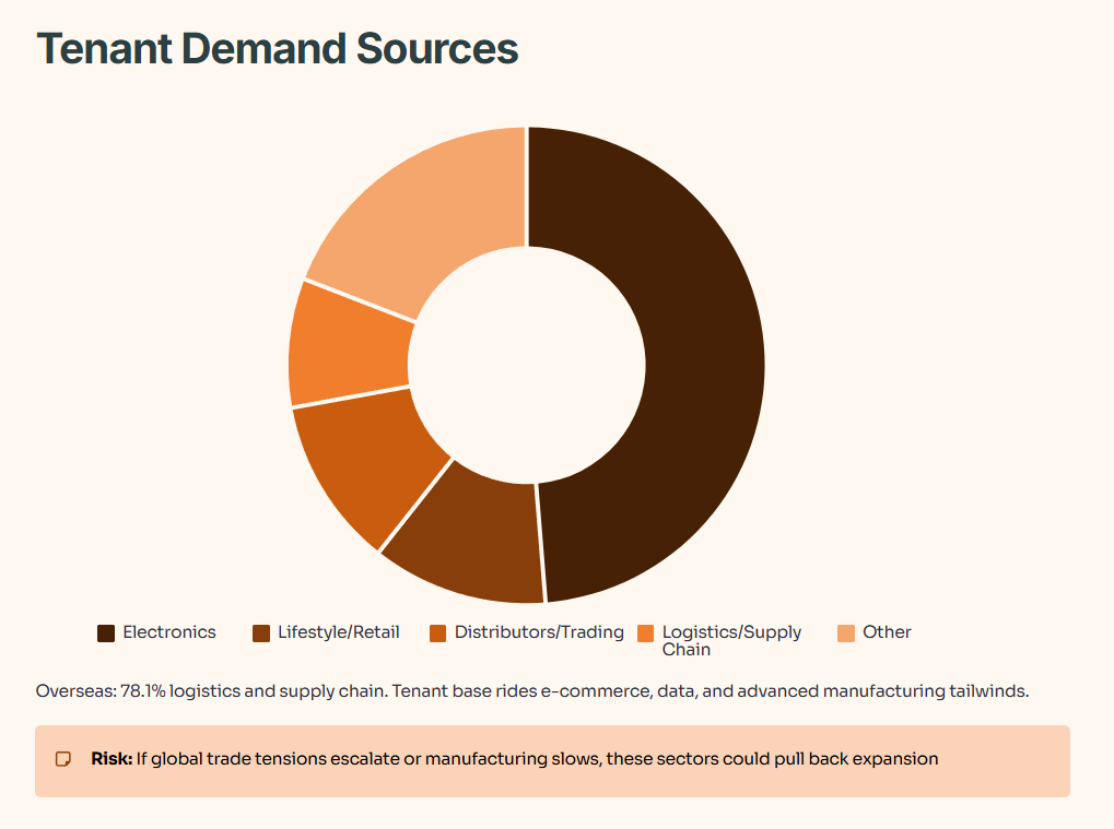 Sources of new demand in 3Q 2025 skewed heavily toward electronics (49.1%), lifestyle/retail/consumer products (11.8%), distributors/trading (11.4%), and logistics/supply chain (8.6%) in Singapore. Overseas, logistics and supply chain dominated at 78.1%. This tells you CLAR’s tenant base is riding secular tailwinds in e-commerce, data, and advanced manufacturing.