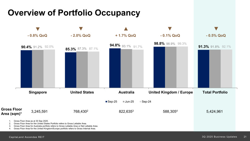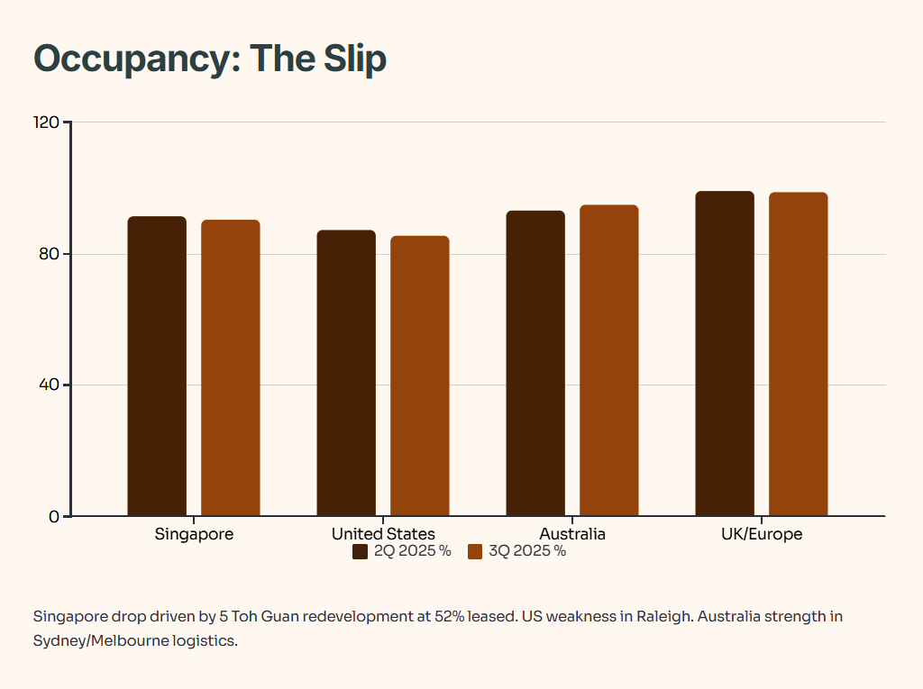 Portfolio occupancy dropped to 91.3% from 91.8% the previous quarter. Singapore occupancy fell from 91.2% to 90.4%, dragged down by the 5 Toh Guan Road East redevelopment hitting the books at only 52% leased. Excluding that property, Singapore occupancy would have held steady at 91.1%. US occupancy slipped from 87.3% to 85.3%, mainly due to weaker leasing in Raleigh. Australia jumped from 93.1% to 94.8%, driven by strong logistics leasing in Sydney and Melbourne. UK/Europe stayed rock-solid at 98.8%.