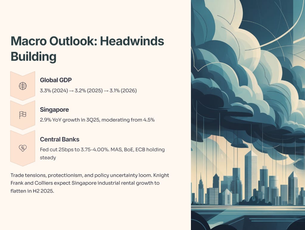 The macro section is blunt. Global GDP growth is projected to slow from 3.3% in 2024 to 3.2% in 2025 and 3.1% in 2026, according to the IMF. Trade tensions, protectionism, and policy uncertainty loom large. Singapore’s GDP grew 2.9% year-on-year in 3Q 2025, moderating from 4.5% in 2Q 2025. Core inflation edged up to 0.4% in September 2025. The Monetary Authority of Singapore (MAS) held policy steady in October, noting that growth has been stronger than expected but caution remains warranted.