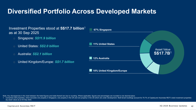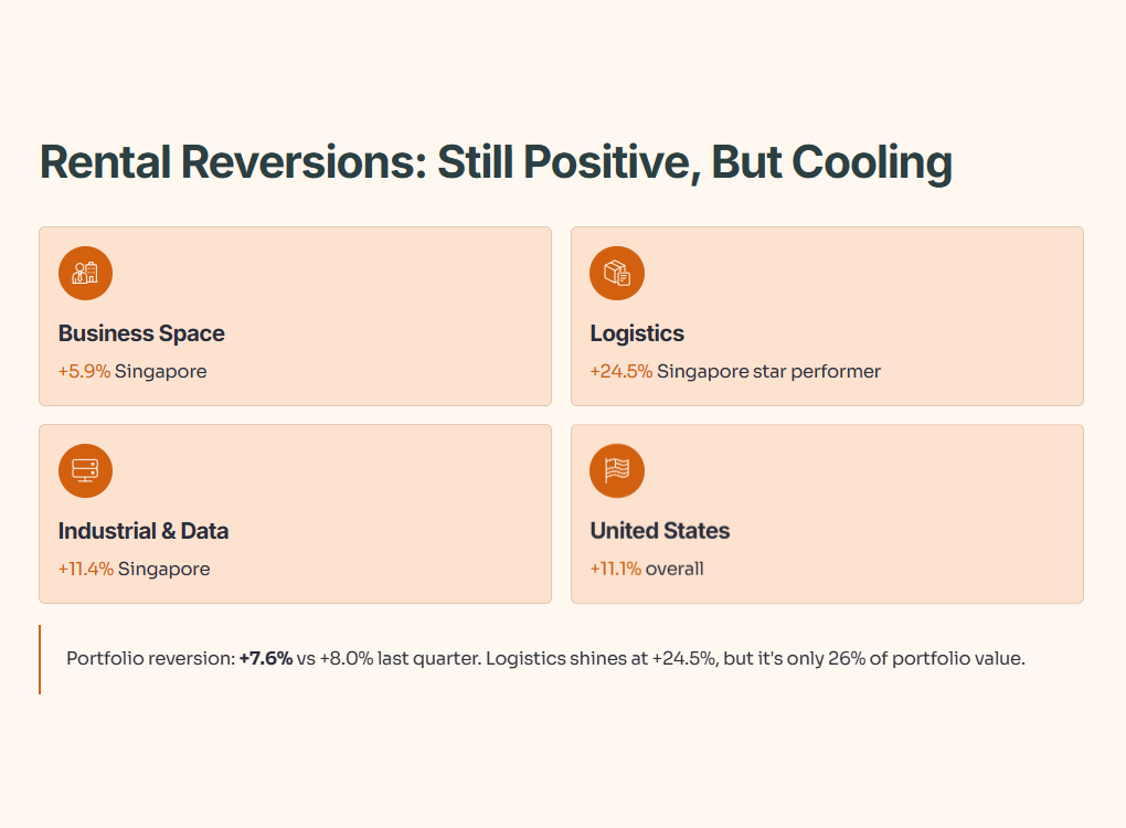 The rental reversion story is still positive but cooling. Singapore posted +8.5% reversion in 3Q 2025, with business space at +5.9%, logistics at +24.5%, and industrial/data centres at +11.4%. The US clocked +11.1%, Australia had no significant renewals, and UK/Europe saw a slight -2.5% reversion in data centres. Overall portfolio reversion: +7.6%, down from +8.0% in 2Q 2025.