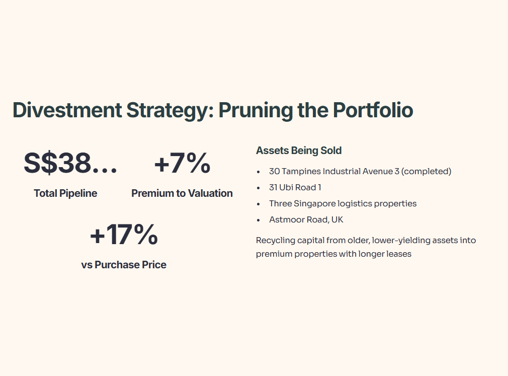 On the divestment front, CLAR is pruning older, lower-yielding assets. It completed the sale of 30 Tampines Industrial Avenue 3 for S$23.0 million at a 5% premium to valuation, and has ongoing divestments totalling S$358.5 million—including 31 Ubi Road 1, three logistics properties in Singapore, and Astmoor Road in the UK. Total divestment pipeline: S$381.5 million at roughly 7% above total valuation and 17% above original purchase price.