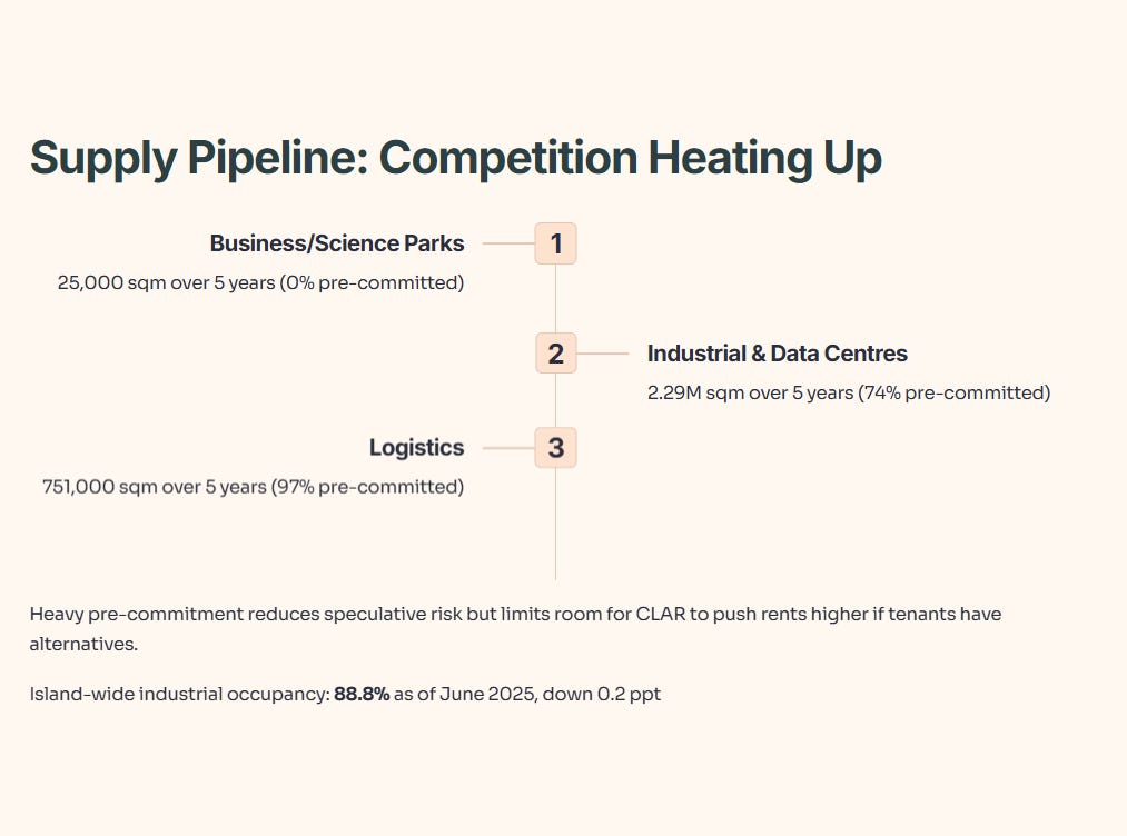 New supply in Singapore over the next five years: 25,000 sqm of business/science park space (0% pre-committed), 2.29 million sqm of industrial/data centres (74% pre-committed), and 751,000 sqm of logistics (97% pre-committed). The heavy pre-commitment in logistics and industrial suggests limited speculative risk, but it also means less room for CLAR to push rents higher if tenants have alternatives.