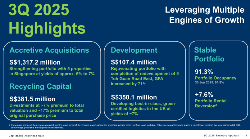 Here’s where the fireworks start. CLAR announces it deployed S$1,317.2 million across five properties in Singapore at yields of roughly 6% to 7%. That’s aggressive capital deployment in a quarter when most REITs are sitting tight. The portfolio occupancy stands at 91.3%, down 0.5 percentage points from 91.8% in June 2025. Rental reversion clocked in at +7.6%, still healthy but cooling from the +8.0% posted last quarter.