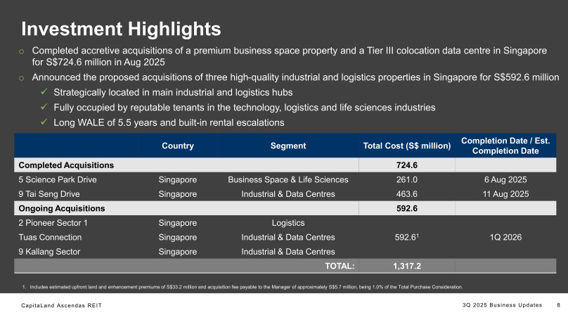 On top of that, CLAR announced three ongoing acquisitions totalling S$592.6 million—2 Pioneer Sector 1, Tuas Connection, and 9 Kallang Sector—all in Singapore, all fully occupied by technology, logistics, and life sciences tenants, and all boasting a combined WALE of 5.5 years with built-in rental escalations. Expected completion is 1Q 2026.