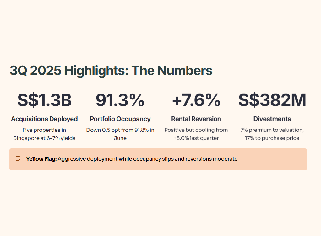 From a Singapore investor’s standpoint, you want your REIT manager to balance growth with prudence. CLAR is clearly in growth mode—deploying S$1.3 billion in a single quarter is aggressive. That’s fine if the acquisitions generate strong returns, but if occupancy wobbles or rental reversions turn negative, the downside risk magnifies.