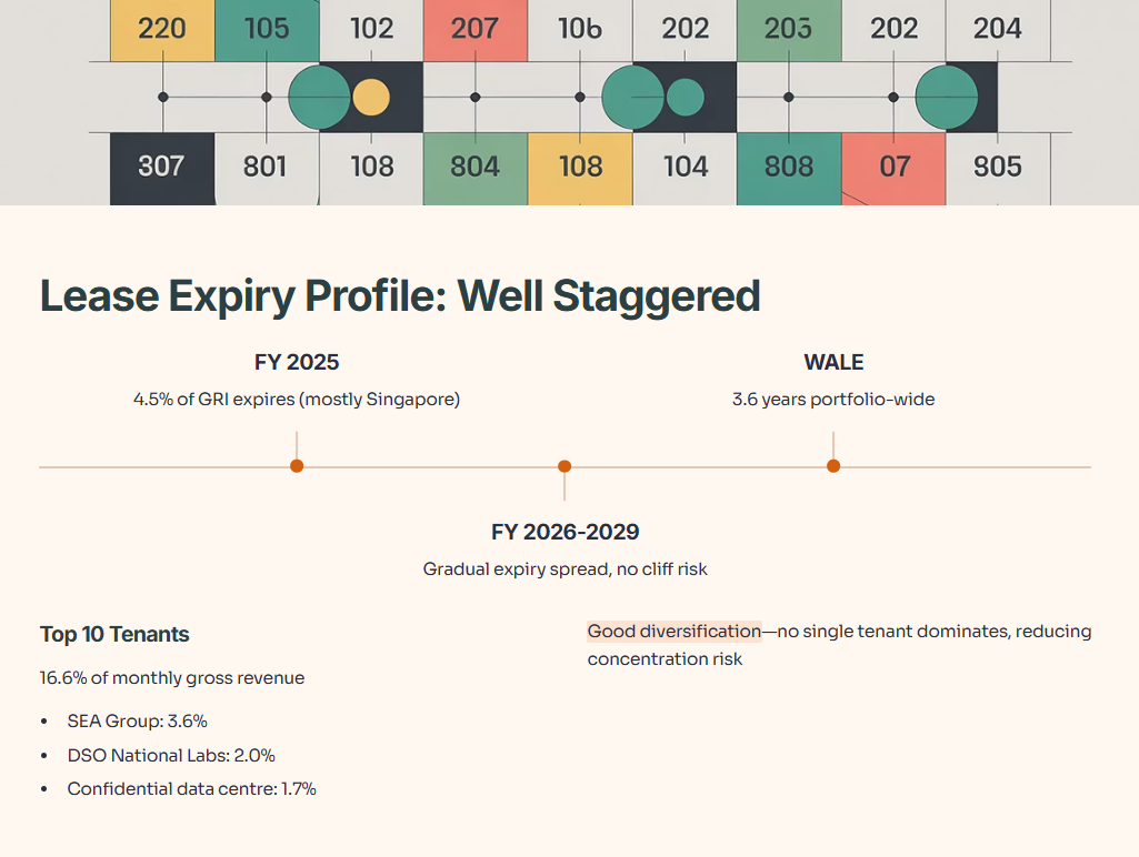 The weighted average lease expiry (WALE) sits at 3.6 years for the total portfolio, with Singapore at 3.3 years, the US at 4.6 years, Australia at 3.8 years, and UK/Europe at 5.4 years. Only 4.5% of gross rental income expires in the remainder of FY 2025, and most of that is in Singapore (91.2% of expiring leases). The lease expiry profile is well-staggered through FY 2029 and beyond, so there’s no immediate cliff risk.