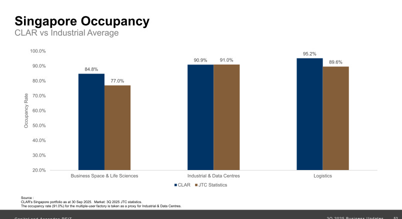 CLAR’s ESG credentials are strong. Green-certified properties now account for 61% of portfolio GFA, up from 49% in June 2025. That’s a net increase of 26 certifications in 3Q 2025 alone, driven by targeted acquisitions, redevelopment, and greening of existing properties. The REIT holds a 4-star GRESB rating, an ‘A’ public disclosure rating for the sixth consecutive year, an MSCI ESG ‘AA’ rating for the third straight year, and came in 2nd place in the Singapore Governance & Transparency Index for REITs and Business Trusts.