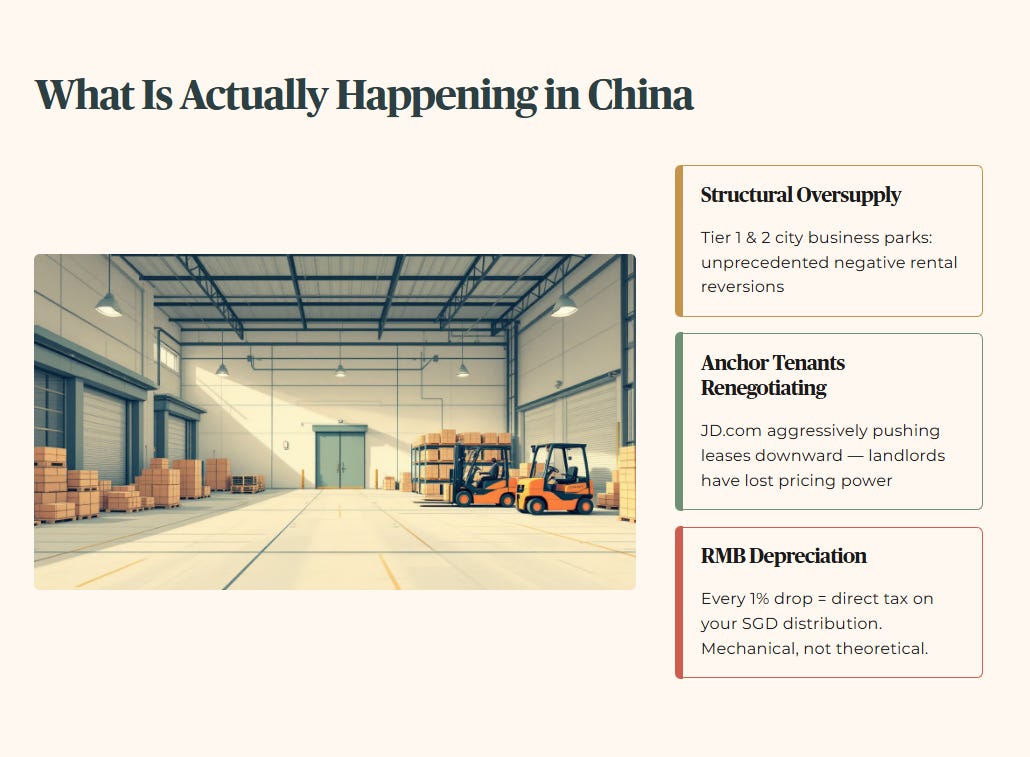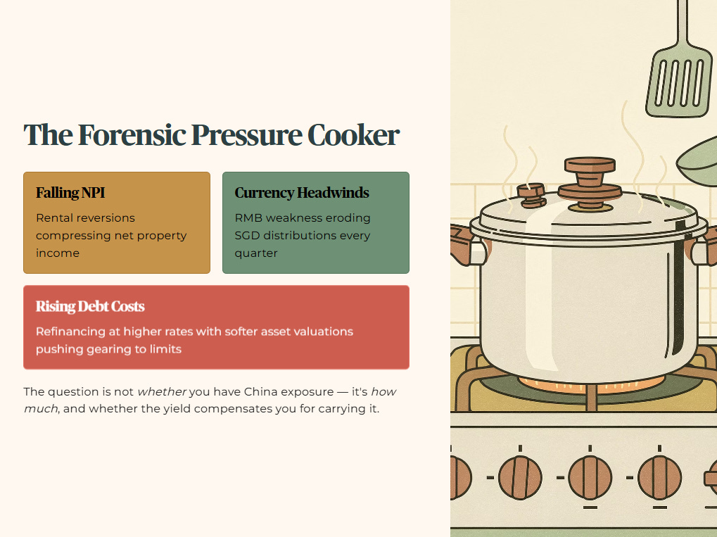 The RMB dimension compounds the damage for Singapore investors specifically. When a China-exposed REIT collects rent in RMB and distributes in SGD, every percentage point of RMB depreciation is a direct tax on your distribution. This is not a theoretical risk — it is a mechanical reality that flows directly from the income statement to your bank account every quarter.