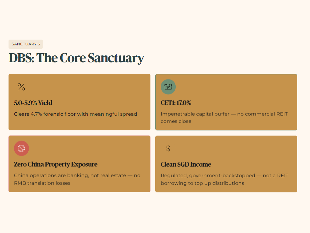 DBS answers that question directly. Based on its 2025 dividend, DBS currently yields a little above 5%, clearing our 4.7% forensic floor with room to spare. Its CET1 capital ratio sits comfortably above regulatory minima and far beyond what any commercial REIT can offer, giving you a fundamentally different loss‑absorption profile. DBS’s China footprint is primarily through banking relationships rather than owning commercial property, which is a very different exposure profile from a China‑heavy REIT.