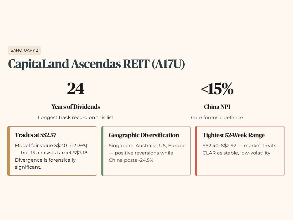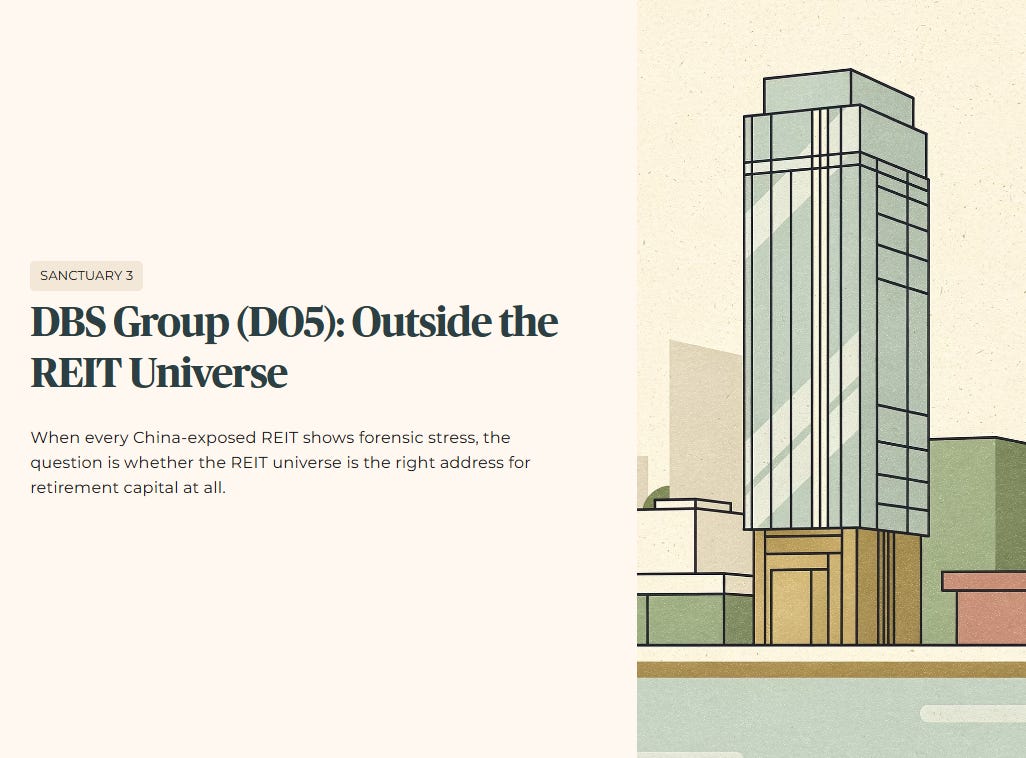 We are stepping outside the REIT universe for the third sanctuary — deliberately. When every REIT in the China-exposure cohort is showing forensic stress, the forensic question is not which China REIT is least bad. The question is whether the REIT universe is the right address for your retirement capital at all right now.