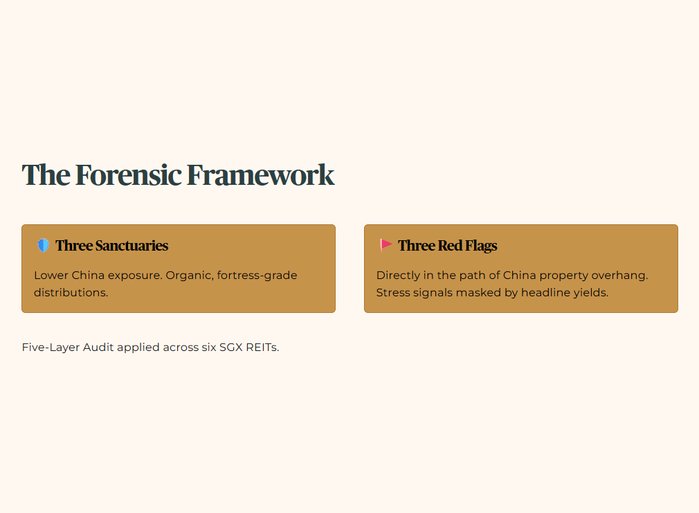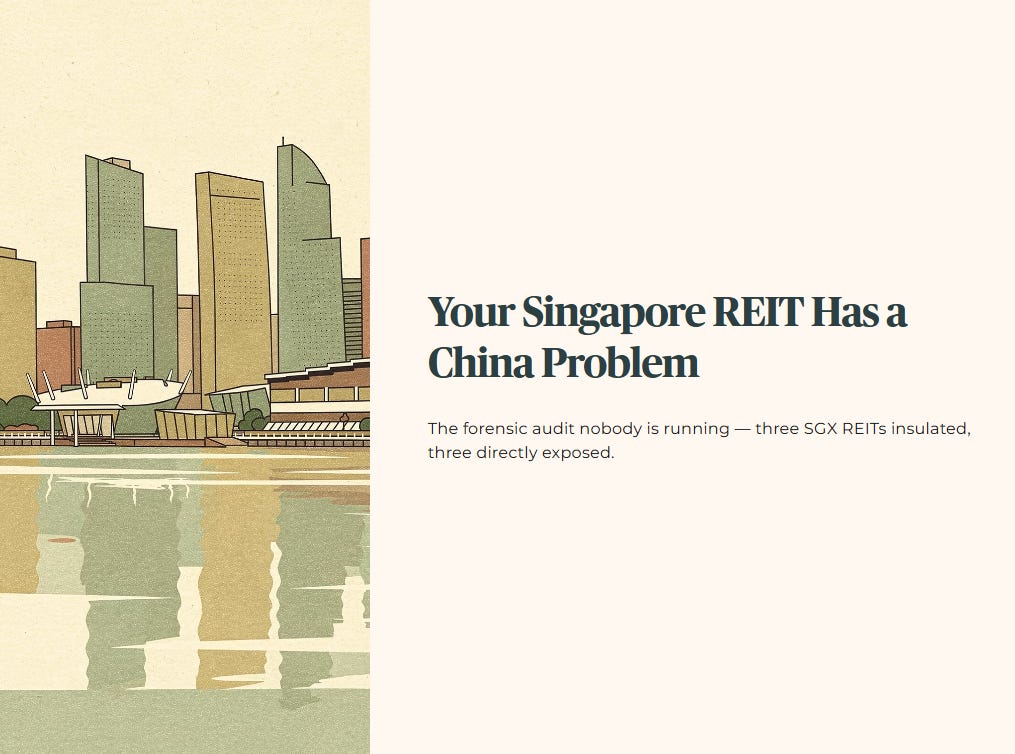 We are applying the Five-Layer Audit across six SGX REITs today. Three have meaningfully lower China exposure and are generating organic, fortress-grade distributions. Three are directly in the path of the China property overhang and are showing forensic stress signals that the headline yields are masking.