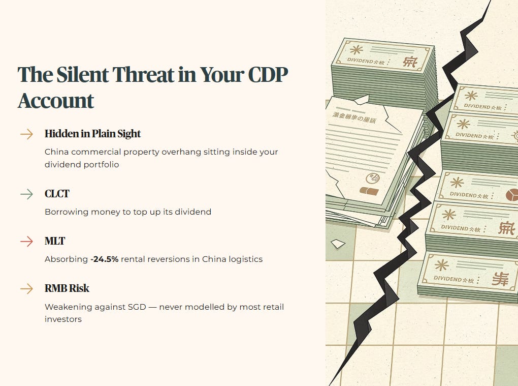 The China commercial and logistics property overhang is not a distant macro story. It is sitting inside your dividend portfolio right now, quietly compressing the net property income that funds your quarterly distribution cheque. CapitaLand China Trust has been using divestment gains and capital recycling to top up distributions despite weaker underlying NPI. CapitaLand China Trust has reported -24.5% rental reversions in its logistics portfolio, a brutal datapoint in an oversupplied market where anchor tenants are aggressively re‑pricing leases. And the RMB has been weakening against the SGD in a way that most retail investors have never modelled.
