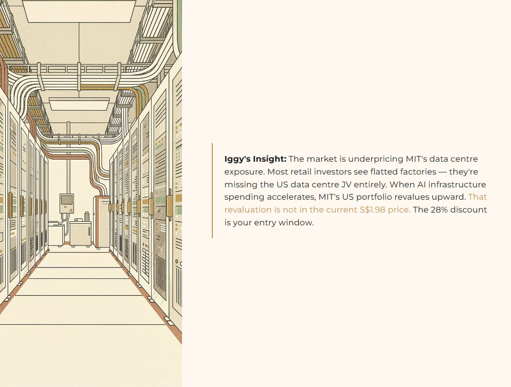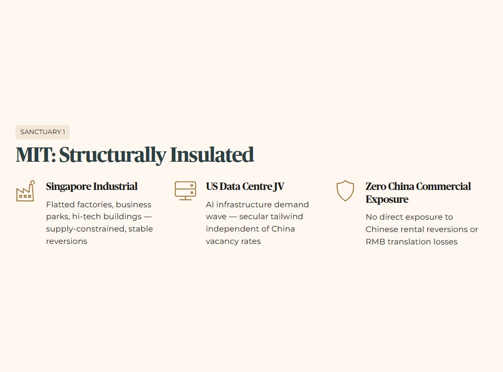 Historically, MIT’s portfolio has been anchored in Singapore flatted factories, business parks, and hi-tech industrial buildings, with a meaningful data centre component through its US joint venture with Mapletree Investments. This is structurally insulated from Chinese commercial property stress. The data centre demand tailwind — driven by AI infrastructure build-out across the US and Singapore — provides a forward growth engine that has nothing to do with Chinese rental reversions.