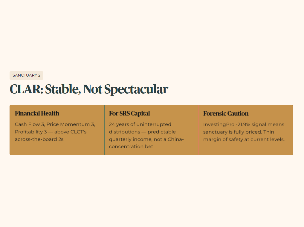 One forensic caution: the InvestingPro model’s 21.9% downside signal means CLAR’s sanctuary status is currently fully priced into the market. You are paying a premium for the safety — which is appropriate for retirement capital, but means the margin of safety on entry is thin at current levels.