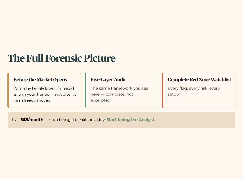Iggy’s Elite Investors don’t just get the report earlier. They get the full forensic picture the moment it’s finalised — zero-day breakdowns, the complete “Red Zone” watchlist, and institutional-grade cheatsheets built around the same Five-Layer Audit you see here. The difference is they get it before the market opens, not after it has already moved.