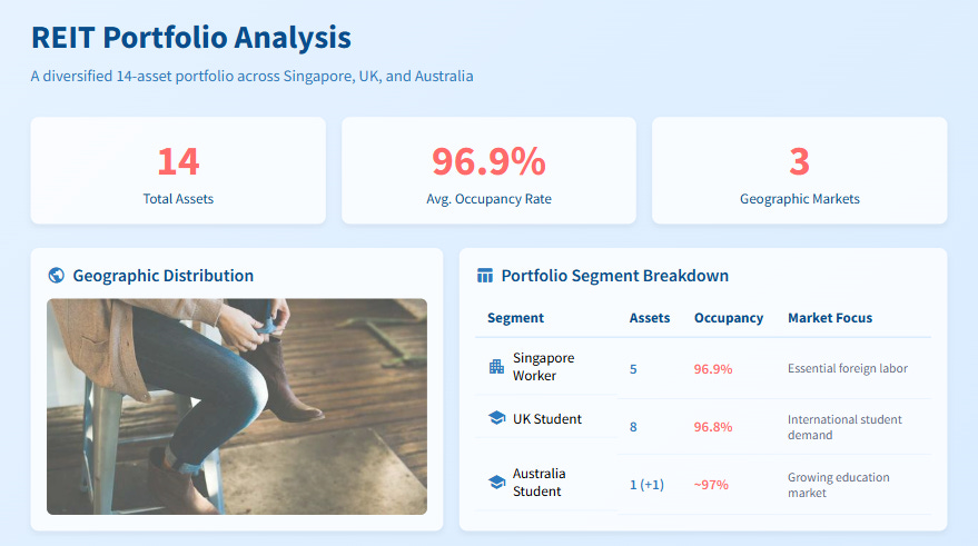 This table shows the REIT’s balanced portfolio across Singapore, the UK, and Australia. By targeting different long-term demographic trends in each country, the portfolio builds in a layer of resilience that single-market or single-purpose REITs lack.