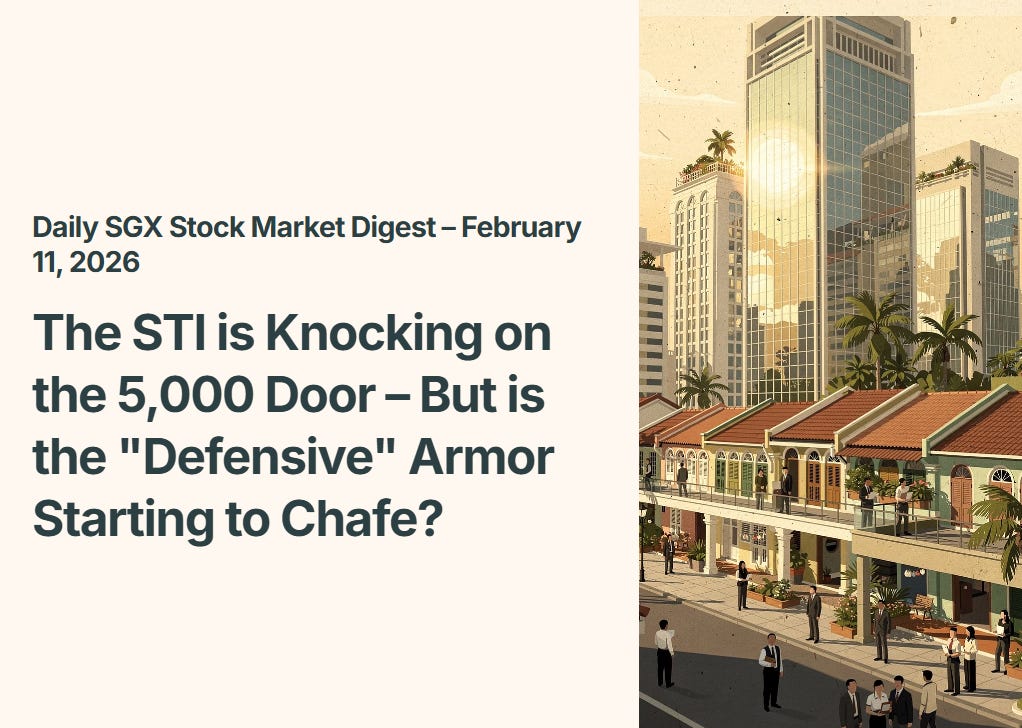 Vibe Check: It’s a “glass half-full” morning on the Lion City’s trading floor. The Straits Times Index (STI) continues its steady grind toward the elusive 5,000 psychological barrier, fueled by a “Goldilocks” macro backdrop where local growth remains resilient while the Fed teases potential cuts. However, beneath the surface of the index’s record-breaking run, we’re seeing the first signs of valuation fatigue in the ultra-reliable consumer names and some massive revaluation “bath-taking” in the real estate giants.