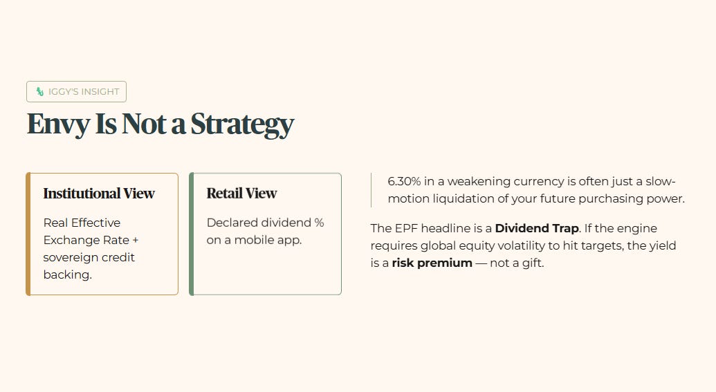 The 6.30% EPF headline acts as a Dividend Trap for those who fail to account for the investment engine’s higher risk tilt. If the underlying engine requires global equity volatility to hit its targets, the yield is not a gift. It is a risk premium. Envy is not an investment strategy, and a 6.30% yield in a weakening currency is often just a slow-motion liquidation of your future purchasing power.