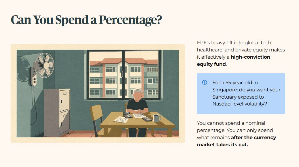 For the investor managing SRS funds, the calculus is even more direct. The EPF’s heavy tilt into global tech, healthcare, and private equity means the fund is effectively running a high-conviction equity fund. If you are a 55-year-old in Singapore, the question is whether you want your retirement Sanctuary exposed to the same volatility as a Nasdaq-heavy portfolio, or whether you prefer the legislated guarantee of the CPF floor. You cannot spend a nominal percentage. You can only spend the value that remains after the currency market has taken its cut.
