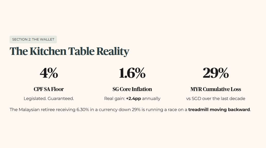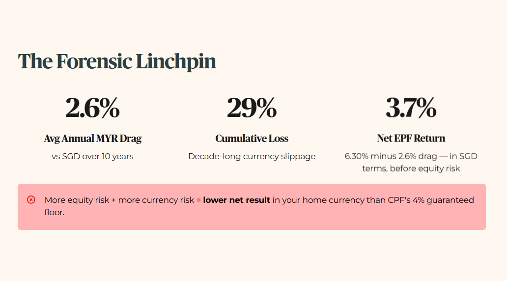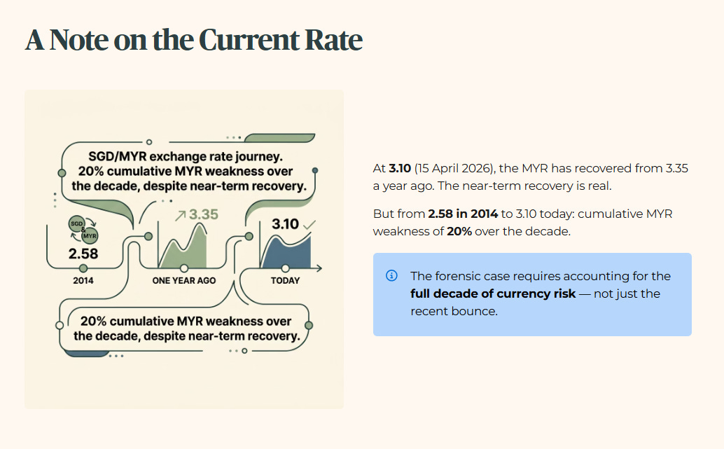 Note on the current SGD/MYR rate: at 3.10 as of 15 April 2026, the MYR has recovered from the 3.35 level of a year ago. That near-term recovery is real and worth acknowledging. The 10-year depreciation story from 2.58 in 2014 to 3.10 today still reflects cumulative MYR weakness of 20% against the SGD over the decade. The forensic case does not require the MYR to weaken every single year. It requires the retirement investor to account for the full decade of currency risk they are accepting when they lock capital into a non-SGD retirement vehicle.