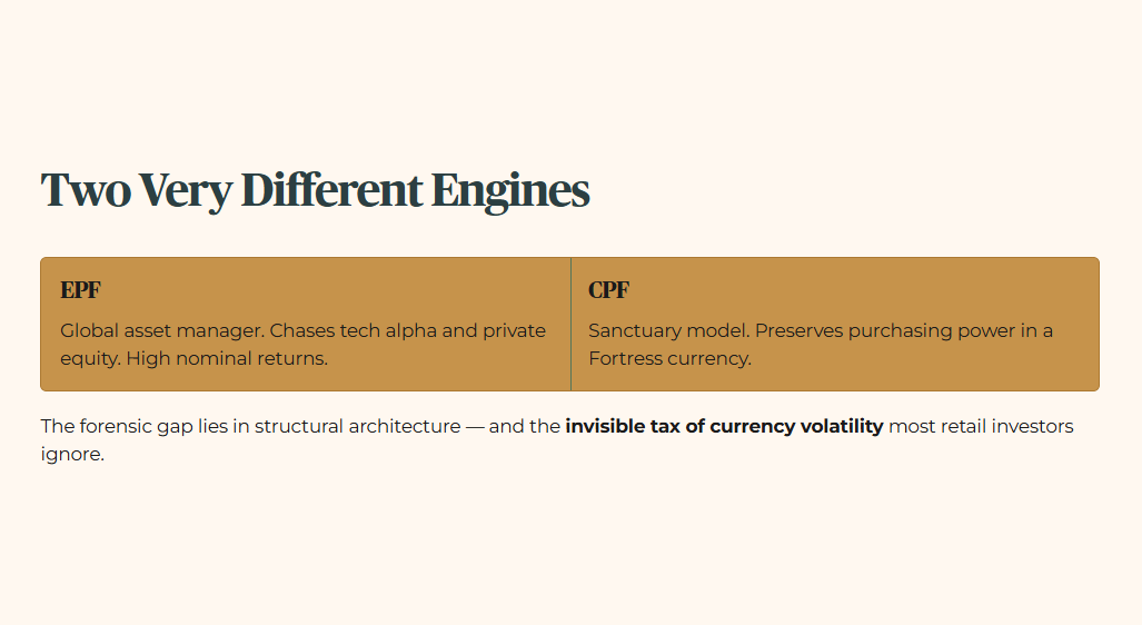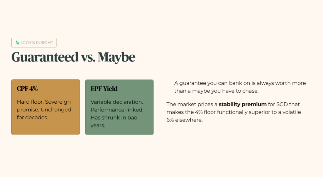 There is a second-order effect retail investors are completely missing: the Legislated Floor versus Dividend Declaration models. The CPF 4% is a hard floor that has not moved in decades, providing a predictable Sanctuary benchmark for all other Singaporean assets. The EPF yield is a variable declaration based on annual performance. In a bad year for global equities, that number can shrink, and has, whereas the 4% CPF SA floor is a sovereign promise. The market is currently pricing in a stability premium for the SGD that makes the 4% floor functionally superior to a volatile 6% elsewhere. A guarantee you can bank on is always worth more than a maybe you have to chase.