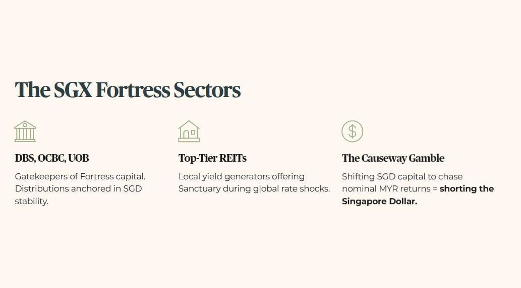 This regional dynamic is already repricing the way forensic investors look at SGX sectors, particularly the local banks and top-tier REITs. DBS, OCBC, and UOB essentially operate as the gatekeepers of Fortress capital. Their distributions are anchored in the same stability that supports the CPF floor. For the heartland investor, the wallet consequence of chasing regional yield is the potential neglect of these local yield generators that offer Sanctuary during periods of global rate shocks. If you shift capital out of a stable SGD environment to chase a nominal return across the Causeway, you are essentially shorting the Singapore Dollar. For a retiree whose expenses, medical, housing, and food, are all priced in SGD, that is a forensic gamble that rarely pays off when the math is stripped of its emotional headline.
