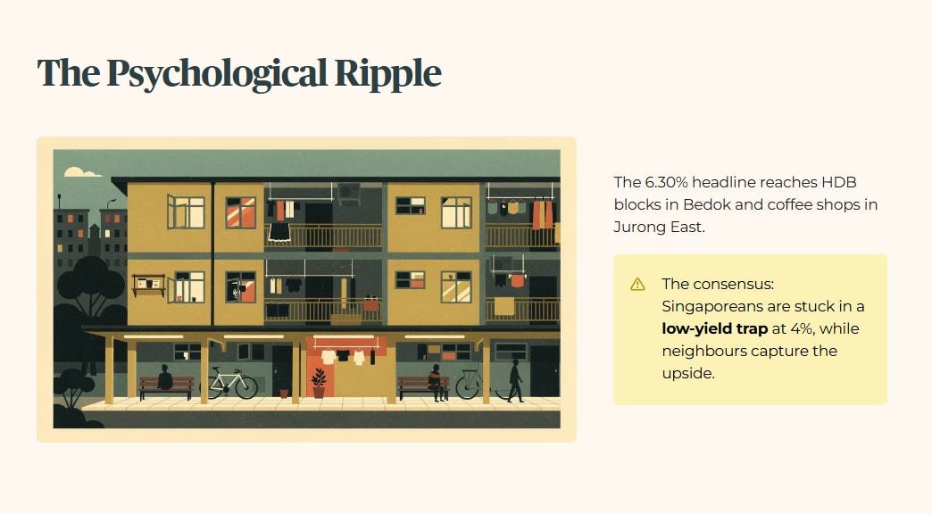 When that figure arrives from Kuala Lumpur, it creates a psychological ripple reaching all the way to the HDB blocks of Bedok and the coffee shops of Jurong East. The consensus narrative says Singaporeans are stuck in a low-yield trap, tethered to a 4% floor while their neighbours capture the upside of a more aggressive, equity-hungry investment mandate.
