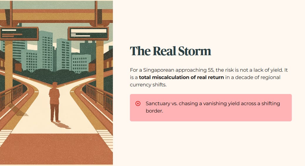 For the Singaporean investor managing a CPF or SRS portfolio, the Storm is not a lack of yield. It is the potential for a total miscalculation of what real return actually looks like in a decade defined by regional currency shifts. The stakes for someone approaching age 55 in Queenstown are not theoretical. They are calculated in the difference between a retirement spent in a stable Sanctuary and one spent chasing a vanishing yield across a shifting border.