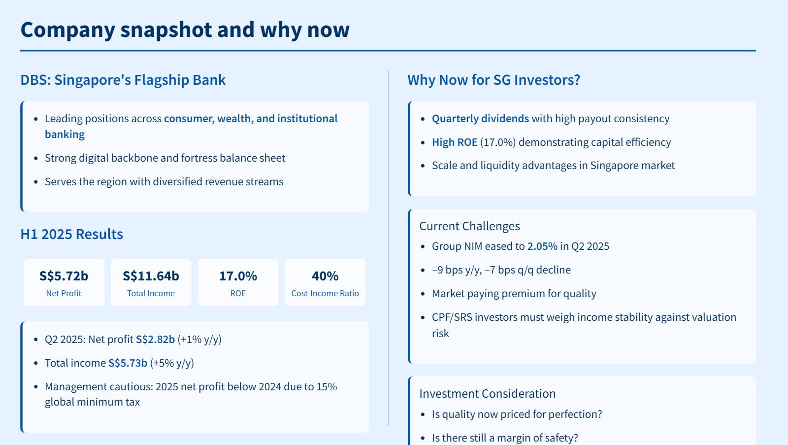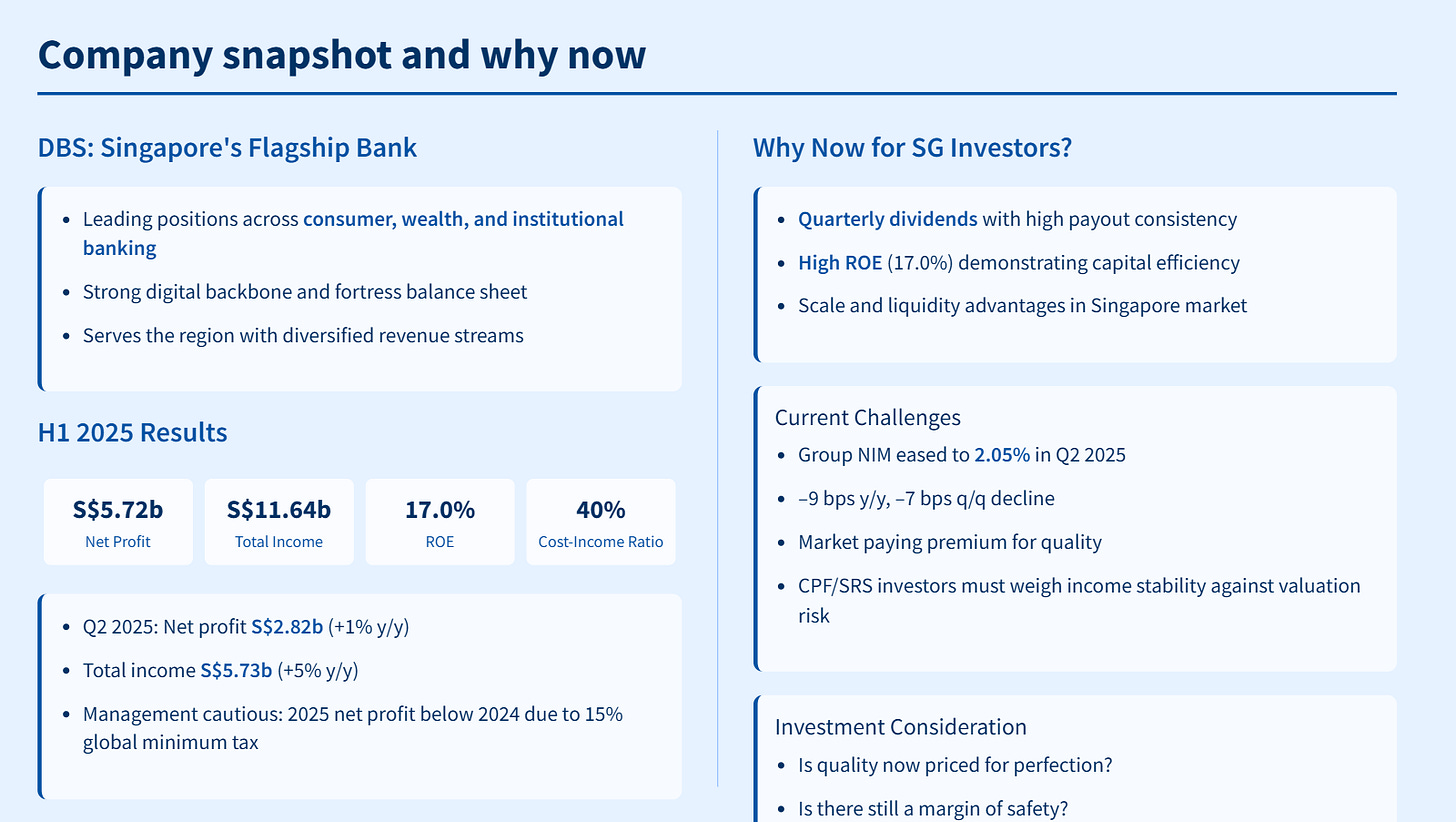 Why now for SG investors? DBS offers quarterly dividends, high ROE, and scale. But the setup is tricky. Group NIM eased to 2.05% in Q2 2025 (–9 bps y/y, –7 bps q/q). The market still pays up for quality. CPF/SRS investors must weigh income stability against valuation risk and the path of rates.
