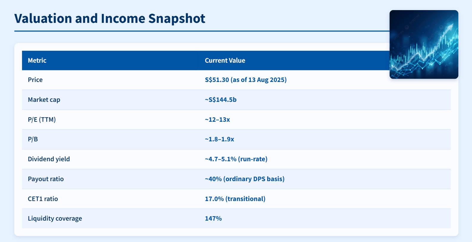 DBS trades at a premium P/B to local peers due to high ROE, digital scale, and balance sheet strength. For income-focused SG investors, a near-5% yield with quarterly payouts compares well to SGS yields. The premium implies the market is pricing steady execution even as margins compress and tax headwinds bite.
